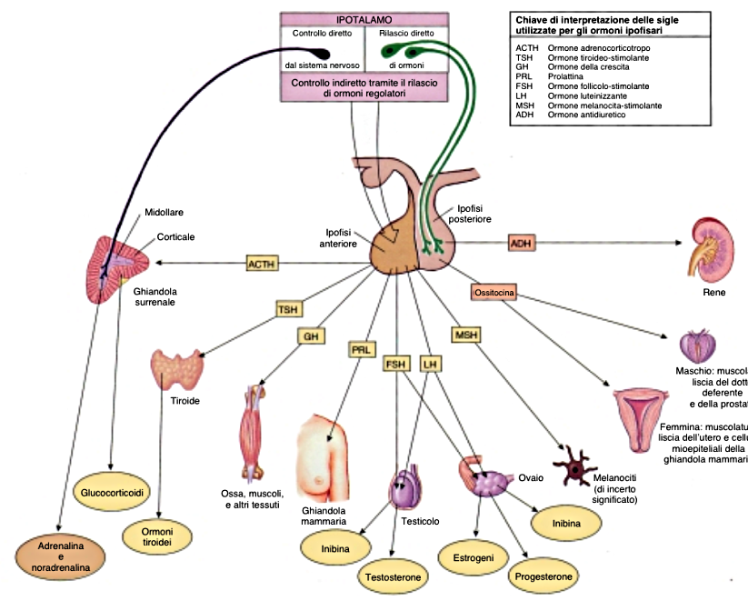 Appena sopra all'ipofisi c'è un'area dell'encefalo, chiamata ipotalamo, estremamente importante per le numerose funzioni che svolge. Oltre all'ossitocina e all'ormone antidiuretico che, come abbiamo appena visto, sono immagazzinati nel lobo posteriore dell'ipofisi, l'ipotalamo sintetizza una decina di fattori di rilascio (RH, dall'inglese Releasing Hormones) che agiscono stimolando o inibendo la secrezione di ormoni da parte dell'adenoipofisi; i fattori di rilascio sono piccoli peptidi costituiti da almeno tre amminoacidi.